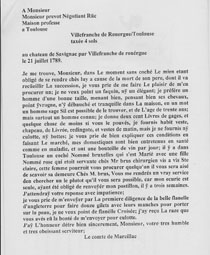 La lettre adressée par le comte de Marcillac de Villefranche-de-Rouergue demande de lui procurer un « coché » et indique que ses « domestiques sont bien entretenus en santé comme en maladie, et ont une bouteille de vin par jour ».